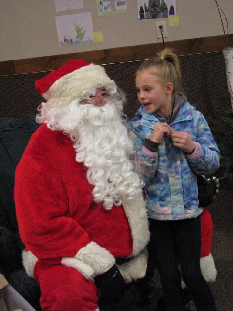 The tree was lit up with its many colored lights on it. It wasn’t even 6 p.m., and nothing was suppose to happen at the Community Center until 7:30. We went back to the Center and waited for awhile while Santa was talking to the children. I also visited with some others that were waiting around. Up on the stage were students from the MMCRU music singing carols for us. There were tables on the left side of the trees were businesses were selling items that kids or people in general could find a Christmas gift. There were people that wrapped these for free. How much better could a shopper ask for?!