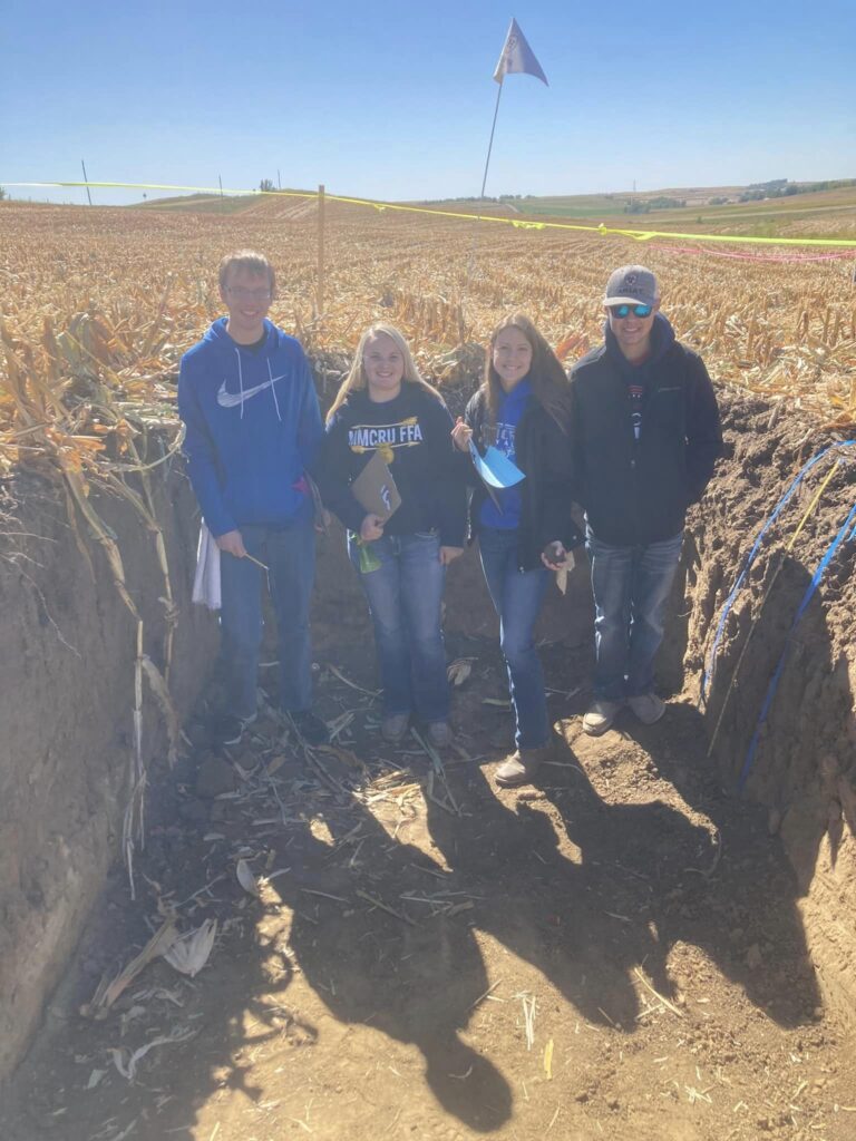 The MMCRU FFA Chapter competed in the annual Northwest District FFA Soils Evaluation Career Development Event held at Morningside University on September 28th, 2022. Members of the team included: Torey Tentinger, Carson Loutsch, Kaden Neddermeyer, and Sophie Hohbach. FFA teams from 27 chapters, including 100 individuals participated in this year’s Career Development Event designed to provide the students an opportunity to display their agricultural knowledge and skills in the area of Soils Evaluation. The Soils Evaluation Career Development Event included the evaluation of four soil pits, plus a written exam about soils in Iowa. The score card used to judge the soil pits is divided into five parts: Surface Features, Soil Features –The Profile, Land Capability Classification and Productivity Potential, Evaluation of Management Practices, and Sustainability of Soils for Non-Agricultural Uses.