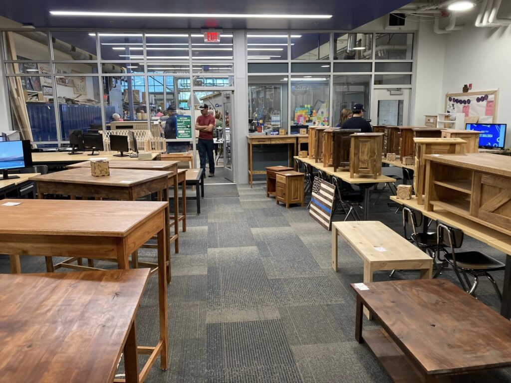 In the past, a class has worked on clocks. This year they worked on night stands. Some of these had engraved designs as well as the maker’s name engraved on the stand. There were table tops made that were sanded, stained, and varnished to perfection. If a person had wall space, there was one project that would have taken up wall space. It would have probably been served as an entertainment center.