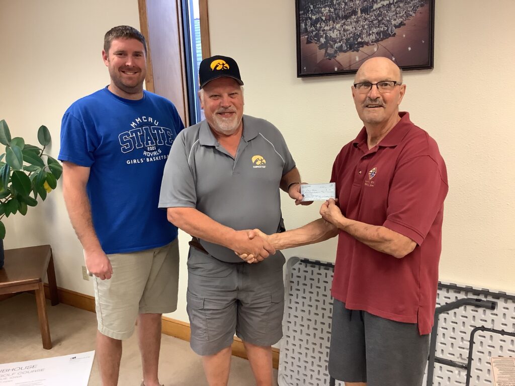 Pictured is Larry Rapagnani, Chair of the KofC pancake breakfast, presenting a check for $1800, proceeds from the breakfast, to Mayor Pat Bunt. This donation will go towards the new Golf Course ClubHouse. Tim Holmes, ClubHouse Board member looking on.