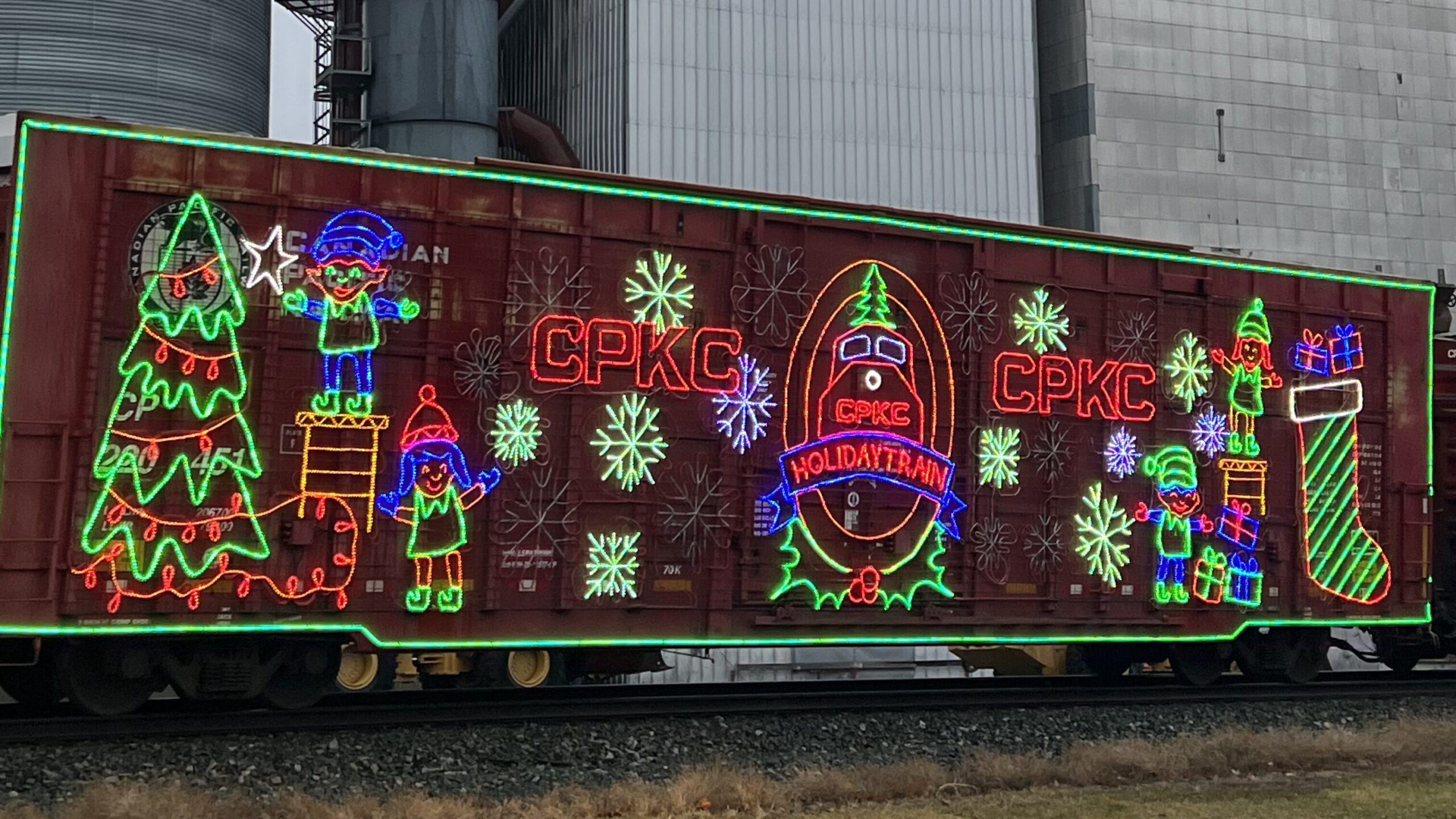 The beautiful lights stay on as each train travels across the CPKC network. In areas where they travel on track that is not CPKC, the lights may be turned off. Each Holiday Train is about 1,000 feet long and consists of 14 rail cars decorated with LED lights and holiday designs.