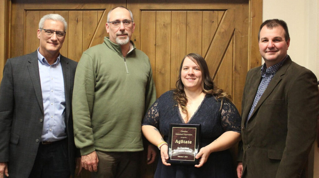 AgState was awarded Cherokee Inustrial Corporation Award at the CAEDC Annual Banquet on February 1st at the Marcus Community Center, Kellen Ludvigson CADEC member presented the award. Picture by Erin Rydgren