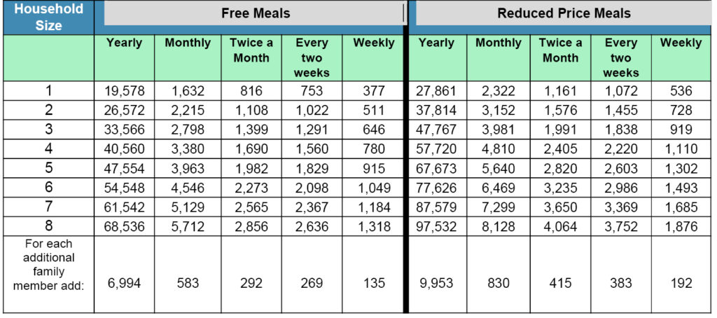 Households whose income is at or below the levels shown are eligible for reduced price meals or free meals, if they complete an application for free and reduced price school meals/milk. Households may complete one application listing all children and return it to your student’s school. When completing an application, only the last four digits of the social security number of the household’s primary wage earner or another adult household member is needed.