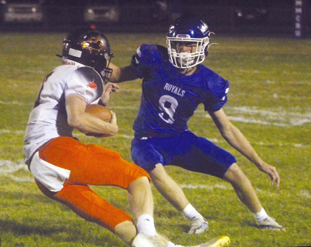 Cody Schmillen (#8) gets ready to take down Generals Kayne Julius (#6) back during Royals home football action held Friday against Sibley-Ocheyedan in Marcus. Photo by Vanessa Rohwer.