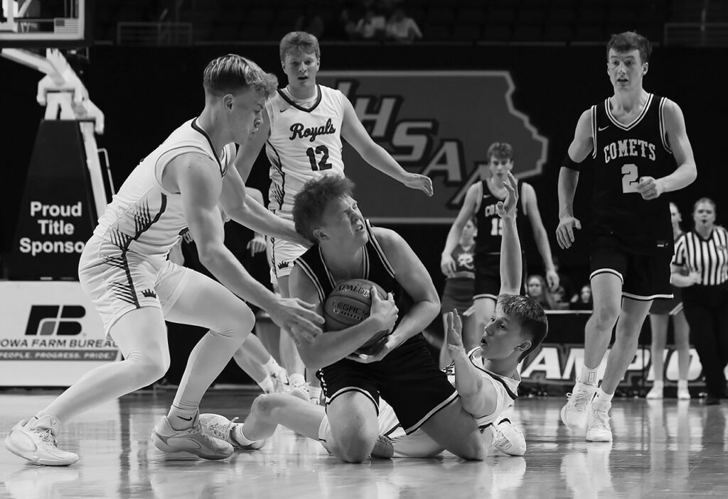 The Royals were back in their groove during the second quarter, although at a bit slower and less aggressive manner. They were making their shots and forcing turnovers. The Royals got the score to 17-10. Then 17-12. Josh Peterson stole the ball and was promptly fouled by BH junior Tyler Pottebaum. MMCRU inbounded and gave Schlenger the ball. He drilled a 3-pointer making it a 20-12 game. A bad BH pass gave Schlenger a steal and getting another 2. BH senior Carter Kleinwolterink answered with a 2. The Royals’ Peterson was fouled, scoring 1 of 2 setting the halftime 23-14 score. Despite a slow start the Royals had established themselves.
